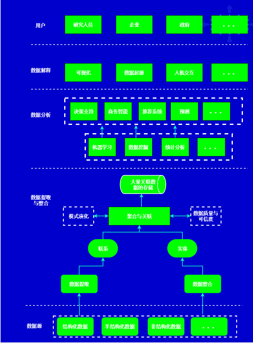 - 数据挖掘: 分类(Classification)、估计(Estimation)、预测(Prediction)、相关性分析或关联规则(Association)、复杂数据类型挖掘(Text、Web、图形图像、视频、音频等)