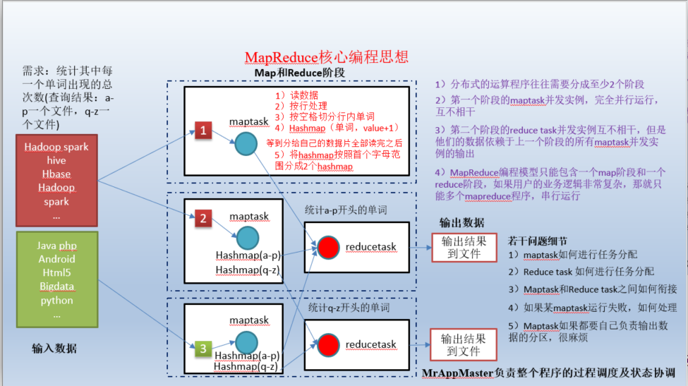 第一个阶段的maptask并发实例,完全并行运行,互不相干。- 第二个阶段的reduce task并发实例互不相干,但是他们的数据依赖于上一个阶段的所有maptask并发实例的输出。