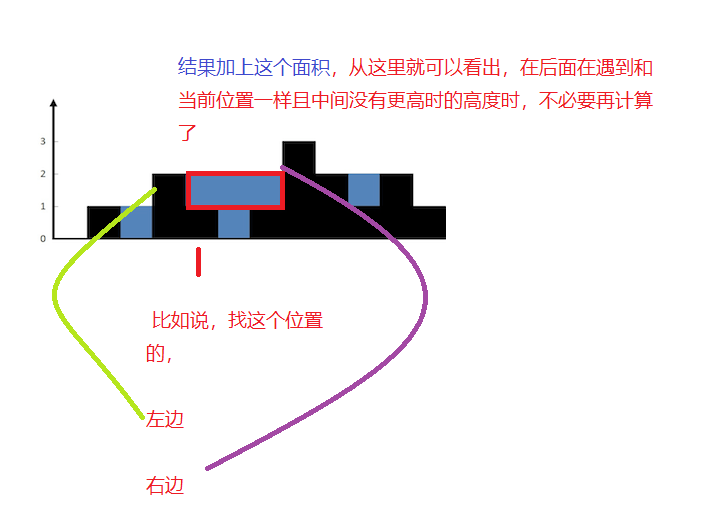 - 首先往左边寻找比当前位置高度的的,往左边寻找时在未遇到比当前高时,遇到相等的表示之前已经找不,就不需要在去找了,因为之前已经找过,以下代码是从左开始遍历的