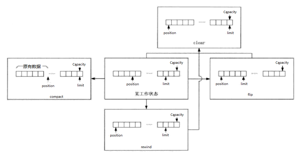 数据,可以在两次读取间使用rewind()方法。compact()方法将position和limit间的数据复制到缓冲区的开始位置,为后续的put()/